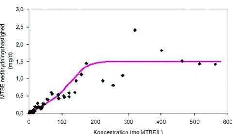 Ved ca. 120 μg/L er omsætningshastigheden reduceret til 50% af den maksimale hastighed, denne koncentration udgør halvmætningskonstanten i Monodkinetikken. Det bemærkes, at halvmætningskonstanten for den MTBE nedbrydende kultur i kolonnen er noget højere end den tidligere bestemte halvmætningskonstant for den suspenderede kultur i 14C-MTBE forsøget, hvor værdien blev bestemt til 63 μg/L. Den suspenderede kultur var altså betydeligt bedre end den fasthæftede (biofilm) til, at nedbryde MTBE ved lave koncentrationer. Dette kan skyldes, at transporten af MTBE ind i biofilmen begrænser den mikrobielle vækst.
