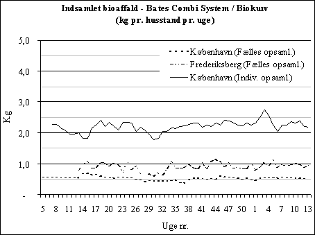 Figur 2.2 viser de indsamlede mængder bioaffald ved husstande med opsamling i Bates Combi System (fælles opsamlingsmateriel) og biokurv (individuelt opsamlingsmateriel), se afsnit 3. Dette opsamlingsudstyr blev anvendt i Frederiksberg og Københavns Kommune.