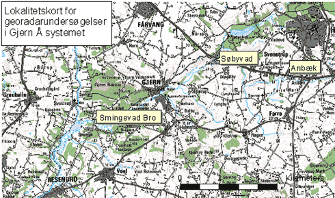 HYdrokemisk interaktion mellem Grundvand og Overfladevand (HYGRO) Bilag 4 Testkortlægning med georadar i Gjern Å systemetDer er udført testkortlægning med georadar på tre lokaliteter i Gjern Å systemet (Figur B4.1). Testkortlægningerne er udført på lokaliteter, hvor der tidligere er udført geologiske og hydrologiske undersøgelser, bl.a. boringer.