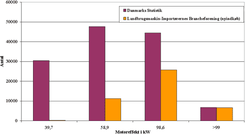 Figur 2: Figur 2 viser antal traktorer baseret på salgstal fra Landbrugsmaskin-Importørernes Brancheforening for perioden 1986-2000 og fra Danmarks Statistik for traktorer i brug fra 1996 og 1999. Der er god overensstemmelse mellem de to kilder for de store traktorer, som altså både må være nye og med i Dansk Maskinhandlerforenings salgstal, hvorimod de mindre traktorer ikke er med i salgsstatistikken, enten fordi de er solgt udenom foreningen, eller fordi de er ældre end fra 1986. I Landbrugsmaskin-Importørernes Brancheforening regner man med, at alle store traktorer er med, men at kun ca. 80% af de mindre traktorer er med i statistikken. Når der tages højde for det, kan det beregnes, at 75.897 traktorer må være ældre end 1986. Disse fordeles på de tre effektgrupper, der "mangler" traktorer, se figur 2, og derefter i forhold til salget af traktorer i 1986. Resultatet er, at antallet af traktorer fordelt på det år, de er købt, er som vist i figur 3.