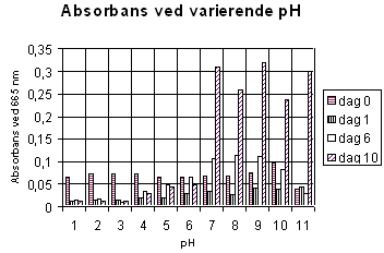 Formål: At teste reaktionen på alger i kultur ved påvirkning med syrer og baser. Materialer: Stichococcus bacilaris 379/1A Metode: Grønalger dyrkes op i kolbe(r) med BS-medium. pH måling af mediet har vist pH på 5,5. En god tæt algesuspension mixes godt og deles i 11 portioner. Der foretages baggrundsanalyse på Chlorofyl A, som er det dominerende chlorofyl i grønalger, ved spektrofotometer. Suspensionens pH indstilles i intervaller mellem ca. 2 og 12. Der måles igen ved spektrofotometer og derefter med døgns mellemrum over en periode på 10 døgn. Algesuspensionen bliver brun, når algerne dør. Resultatopgørelse: Nedenfor er resultaterne af målinger af absorbans ved forskellig pH afbildet i søjlediagram.