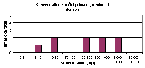 1): Der er ved undersøgelserne udført mellem 2 og 12 undersøgelsesboringer Det ses, at en stor del af datamaterialet indeholder begrænsede undersøgelser (industrikortlægninger og forureningsundersøgelser), mens en mindre del af datamaterialet indeholder omfattende undersøgelser. På 15 (13+1+1) af de 43 lokaliteter er der kun udført en begrænset forureningsundersøgelse, hvor undersøgelsen har bestået af én kort, filtersat boring. For disse lokaliteter stammer den i risikovurderingen anvendte koncentration af MTBE og benzen fra denne ene boring. Boringen på hver af disse lokaliteter er ved planlægningen af undersøgelsen forventeligt placeret ud fra de historiske oplysninger. Det er erfaringsmæssigt vanskeligt at placere en enkelt boring optimalt på en lokalitet, hvor forureningsforholdene ikke tidligere er belyst. Det vurderes derfor, at de ved undersøgelserne målte koncentrationer anvendt til risikovurderingen, næppe repræsenterer den højeste koncentration i det terrænnære grundvand på lokaliteten. Risikovurderingen for disse lokaliteter må derfor forventes at give resultater, som fører til undervurdering af risikoen. På 18 (15+3) af de 43 lokaliteter er der udført en enkelt undersøgelse men med flere filtersatte undersøgelsesboringer. Som i den forrige gruppe er disse boringer afsat på baggrund af historiske oplysninger. Med det øgede antal boringer må det forventes, at der er større sandsynlighed for at påvise koncentrationer, som repræsenterer de højeste koncentrationer på grunden, end i forrige gruppe. Risikovurderingen for disse lokaliteter vil derfor i højere grad være baseret på et datamateriale, som svarer til den reelle risiko. På de resterende 10 af de 43 lokaliteter er der udført mere end én undersøgelse. Da undersøgelserne især har været rettet mod forurening med benzin og olie, må det antages, at i hvert fald benzinforureningen er rimeligt godt kortlagt. For MTBE er forholdet lidt anderledes, fordi MTBE først er begyndt at indgå i overvågningsprogrammerne og vandværksanalyserne i de sidste år af 1990erne. Antallet af vandprøver, som er analyseret for MTBE, er derfor generelt begrænset til 1-2 af boringerne på lokaliteten, og det er kun i få boringer, at der målt for MTBE mere end én gang. Derfor vurderes det, at kortlægningen af MTBE generelt for disse lokaliteter er mangelfuld. På 9 af de 43 lokaliteter er der analyseret for både MTBE og benzen i det primære magasin. Her har der således været mulighed for at påvise en evt. forureningsspredning til det primære magasin i de tilfælde hvor filteret har været placeret korrekt. 3.2.3 Vurdering af datakvalitetMed det specifikke formål at trække data ud til brug i JAGG-regnearket, jf. bilag 2.1 og 2.2., vurderes det generelt, at materialet er af meget varierende kvalitet. Det har dog været muligt at udtrække de nødvendige data fra rapporterne. Det har endvidere i de fleste tilfælde været nødvendigt at supplere op med data fortrinsvist om det primære grundvandsmagasin, hvortil oplysninger er hentet fra Fyns Amts potentialekort over det primære grundvandsmagasin og geologiske basisdatakort. På 9 af de 43 lokaliteter findes der analyseresultater fra det primære magasin, som har kunnet bruges til risikovurderingen. På de øvrige 34 lokaliteter er udgangspunktet for de udførte risikovurderinger en koncentration målt i det terrænnære magasin. Disse risikovurderinger involverer derfor også vertikal transport til det primære magasin. Generelt vurderes det, at de anvendte undersøgelser er udført med det formål at lokalisere området med det højeste benzinniveau og dermed benzenkoncentrationen snarere end den højeste MTBE-koncentration. Det vurderes, at vandprøverne på omkring 20% af de undersøgte lokaliteter er udtaget inden for selve kildeområdet enten i det terrænnære eller det primære grundvand, således at den målte MTBE- og benzenkoncentration må forventes af samme størrelsesorden som den maksimale koncentration på lokaliteten. På de resterende lokaliteter vurderes vandprøverne at være udtaget på grænsen af eller uden for kildeområdet. Disse koncentrationer vurderes derfor ikke at repræsentere de maksimale koncentrationer i kildeområdet, men i nogle tilfælde nok den maksimale koncentration i den aktuelle afstand fra kildeområdet. 3.3 Målte koncentration af MTBE og benzen3.3.1 Fordeling af målte koncentrationerPå de 43 lokaliteter er niveauerne af de målte koncentrationer af MTBE og benzen i terrænnært grundvand og det primære grundvandsmagasin som illustreret i figur 3.1-3.2 hhv. figur 3.3-3.4. For de målte koncentrationer i terrænnært grundvand er endvidere angivet den procentvise fordeling.