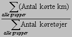 Da kapacitetsudnyttelsen er angivet ved et interval for de enkelte grupper, anvendes intervallets midtpunkt som værdi i beregningen. For en kapacitetsudnyttelse på 76-85% anvendes værdien 80%. Resultatet bliver et procent-tal. Kapacitetsudnyttelsen er angivet i intervaller for de enkelte grupper, men i benchmarkingen angives det som absolutte værdier. For intervallet 96-100% anvendes værdien 98%. Det gennemsnitlige antal kilometer pr køretøj beregnes ved: