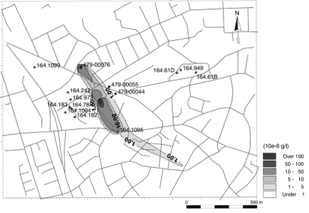 Risikovurdering af MTBE-forurening i forhold til grundvandet - bilagsrapport 5 Bilag 4: stoftransportsimuleringBilag 4.1. Beregnet udbredelse af MTBE-forurening i den øverste del af det primære magasin (konservativ transport).