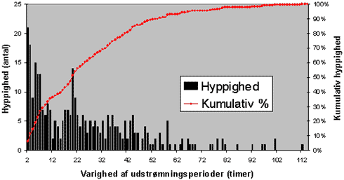 Figur 5.23 For at vurdere, om længden af udstrømningsperioderne følger en statistisk fordeling som fx en logaritmisk normalfordeling, er der optegnet et histogram, jf. figur 5.23. Fordelingen ligner ikke umiddelbart en log-normal fordeling. I forhold til den aritmetriske middelværdi for længden af udstrømningsperioderne, er medianværdien ca. 20 timer og således lidt lavere. Det samme er tilfældet for det afkastede luftvolumen, hvor medianværdien er ca. 23 m3, og således væsentlig lavere end det simple gennemsnit på 35 m3. De hyppigst forekommende udstrømningsperioder er under 8 t i varighed, men der ses også en relativ stor hyppighed for udstrømningsperioder med en varighed lige omkring 20 t. Den relativt store hyppighed omkring de 20 timer kan være relateret til den 24-timers periode, som er indlejret i det atmosfæriske tryks naturlige variation som følge af solindstrålingens døgnsvingning /ref. 23/. I den ekstreme ende af skalaen ses en lille gruppe på ca. 15 hændelser, hvor der har været kontinuert udstrømning i mere end 72 timer (3 døgn) og helt op til 112 timer (4,5 døgn). 5.4.2 PoreluftkoncentrationerFor at følge udviklingen i poreluftens koncentration af PCE i måleperioden, er der gennemført en række målinger i de 6 passivt ventilerende filtre, jf. bilag 3.7. Der er udført i alt 6 moniteringsrunder, hvor koncentrationerne af den udstrømmende luft er målt over ca. 15 min. Herudover er der i målebrønden i PV11 udført 3 kontinuerte måleserier med 15 min.s intervaller af 1-2 ugers varighed, med det formål at få indsigt i variationen af koncentrationen over flere efterfølgende udstrømningsperioder i løbet af den 2-årige måleperiode. Samtlige måledata er afbildet i bilag 3.7. Resultaterne af de 5 målerunder er afbildet logaritmisk på figur 5.23, mens de samme data er afbildet på en lineær skala i bilag 3.7. Betragtes hele måleperioden, kan der registreres et overordnet eksponentielt aftagende koncentrationsniveau for de 3 filtre PV10, PV11 og PV13, mens koncentrationen stiger i PV12 og er uændret i PV14 og PV15. Koncentrationen i de tre filtre PV12, PV13 og PV15 er ved den første målerunde, udført i december 1999, markant lavere end ved den anden målerunde ca. 4 mdr. senere. Samme tendens ses i øvrigt på den nærliggende lokalitet på Prins Valdemars Alle, jf. tidligere afsnit 5.3.2. Når koncentrationerne ikke som forventet aftager eksponentielt allerede fra første runde, på samme måde som for de to filtre PV10 og PV11, og i øvrigt som i både Askov og Fakse og i andre sager, kan det skyldes, at filtrene alle ligger i udkanten af det område, hvor de højeste poreluftkoncentrationer i den umættede zone findes. Herved vil koncentrationen indledningsvist stige i takt med at kraftigere forurenet poreluft trækkes ud til filtrene, mens der senere på grund af den generelle luftudskiftning i den umættede zone vil ske en fortynding og dermed et koncentrationsfald. Størrelsen af dette generelle koncentrationsfald vil være afhængig af størrelsen af det passive luftflow. For de tre kraftigt forurenede filtre (PV10, PV11 og PV13) sker der et markant fald i koncentrationen af PCE fra 2. til 4. målerunde, svarende til perioden marts 2000- september 2001. Dette fald vurderes at være forårsaget af, at luftudskiftningen i den umættede zone har været tilstrækkelig stor til overvinde den rate hvormed PCE tilføres fra det overliggende lerlag. PV12, der ligger i udkanten af området med de initialt højeste koncentrationer, viser overordnet en svagt stigende tendens. En enkelt meget lav værdi målt i marts 2001 afviger dog fra de øvrige. De svagt stigende værdier indikerer, at der trækkes poreluft ind fra området mellem PV10, PV11 og PV13, hvor den kraftigste poreluftforurening forventes. Ved den 6. og sidste målerunde i juni 2002 er koncentrationerne i specielt PV11 og PV13 igen steget markant i forhold til 5. runde. Netop disse to filtre havde i juni 2002 også en markant lavere specifik ydelse i forhold til de tidligere målerunder, jf. figur 5.22. Det resulterende minimale flow og den meget lave luftudskiftning i den umættede zone kan således ikke i den denne periode opveje udvaskningen af PCE fra det overliggende lerlag. PV10 viser derimod en fortsat aftagende tendens fra 5. til 6. målerunde, hvilket er i god overensstemmelse med at den specifikke ydelse ikke er reduceret væsentligt i denne periode, jf. figur 5.22.