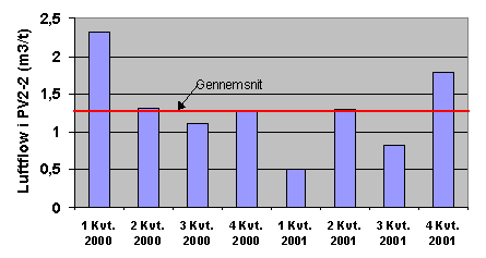 Figur 5.15 Der kan indenfor den relativt korte måleperiode på 2 år ses markante forskelle på det samlede flow i de enkelte kvartaler. De største flow forekommer i 1. og 4. kvartal i både 2000 og 2001, mens de mindste flow optræder i 2. hhv. 3. kvartal. Det gennemsnitlige flow i de enkelte kvartaler varierer således ca. 50% i forhold til det samlede årsgennemsnit. Analyser af en længere dataserie for atmosfæretrykket (1990-2000) bekræfter, at der kan forventes større flow i efterår/vinter sammenlignet med forår/sommer. Der har i alt været registreret 333 udstrømningsperioder med en varighed større end 2 timer, jf. tabel 5.7. Udstrømningsperioderne har haft en gennemsnitlig varighed på 25 timer, med et gennemsnitligt afkastet luftvolumen på 35 m3. Variationsbredden for det gennemsnitlige flow fra de enkelte filtre er fra 0,28 til 0,66 m3/t, hvilket indikerer en ret ensartet effektiv permeabilitet på tværs af grunden. Under ekstremt hurtige fald i atmosfæretrykket er der kortvarigt målt flow op til 10,6 m3/t. For det totale system (5 enkeltfiltre) kan det gennemsnitlige årlige luftflow skønnes til ca. 2,1 m3/t, jf. tabel 5.7. Det maksimale flow er i en kortvarig periode ca. 33,5 m3/t, hvilket svarer til et gennemsnitligt luftflow for hver af de seks boringer på ca. 7 m3/t. 5.3.2 PoreluftkoncentrationerFor at følge udviklingen i poreluftens koncentration af PCE i måleperioden er der gennemført en række målinger i de 5 passivt ventilerende filtre, jf. bilag 2.7. Der er udført i alt 5 moniteringsrunder, hvor koncentrationerne af den udstrømmende luft er målt over ca. 15 min. Herudover er der i målebrønden i PV4 udført 3 kontinuerte måleserier med 15 min.s intervaller af 1-2 ugers varighed, med det formål at få indsigt i variationen af koncentrationen over flere efterfølgende udstrømnings-perioder i løbet af den 2-årige måleperiode. Samtlige måledata er afbildet i bilag 2.7. Til illustration af et typisk driftsforløb, er der på figur 5.16 afbildet luftflow og koncentrationen af PCE+TCE i den udstrømmende poreluft for en 10 dages periode under indkøringen af systemet i december 1999.