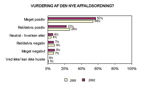 2.4 BorgerundersøgelserÅrhus Kommune har efter indførelse af det nye affaldssystem gennemført en borgerundersøgelse med titlen: "Generel tilfredshed med affaldshåndtering og den nye ordning for husholdningsaffald"35 . Undersøgelsen er opdelt i 2 faser. Første fase blev gennemført i november 2001 og anden fase blev gennemført maj 2002. I første fase af undersøgelsen blev der gennemført i alt 700 interviews 386 i villa/rækkehus og 314 i etageejendomme. Undersøgelsens anden fase bestod af 400 telefoninterviews. De 200 af disse omfattede et tilfældigt udsnit af alle som har været i kontakt med henholdsvis Århus Kommunale Værker og Brugercentret inden for det sidste halve år. 2.4.1.1 Overordnet vurdering I undersøgelsen blev der spurgt til den helt overordnede vurdering af den nye affaldsordning hvor man skal sortere affaldet i henholdsvis grønne og sorte poser om man er meget tilfreds, tilfreds, neutral, utilfreds eller meget utilfreds. Resultatet samt en sammenligning for de 2 faser ses af Figur 2.4.