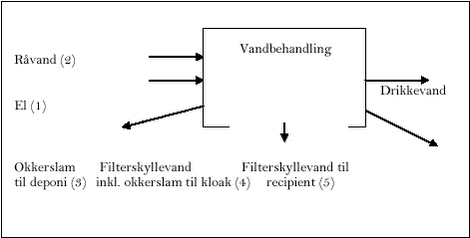 Tegn processen – som et rektangel, og med processens miljøpåvirkninger (fx elforbrug, filterskyllevand ind (og –ud), filterslam ud, forureningsrisiko e.l.) som pile ind i eller ud fra processen. Pilene kan benævnes med nummer eller navn (se nedenfor). Er der for mange, så medtag – aht. overskueligheden – kun de vigtigste.