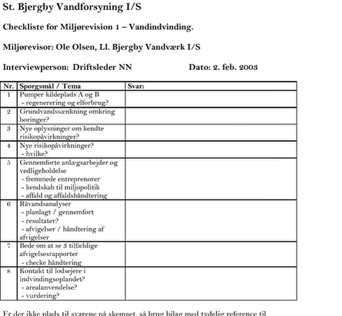 Øvrige oplysninger Miljørevisoren udarbejder selv checkliste for den enkelte miljørevision på grundlag af checklisten for senest afholdte miljørevision og resultatet herfra.
