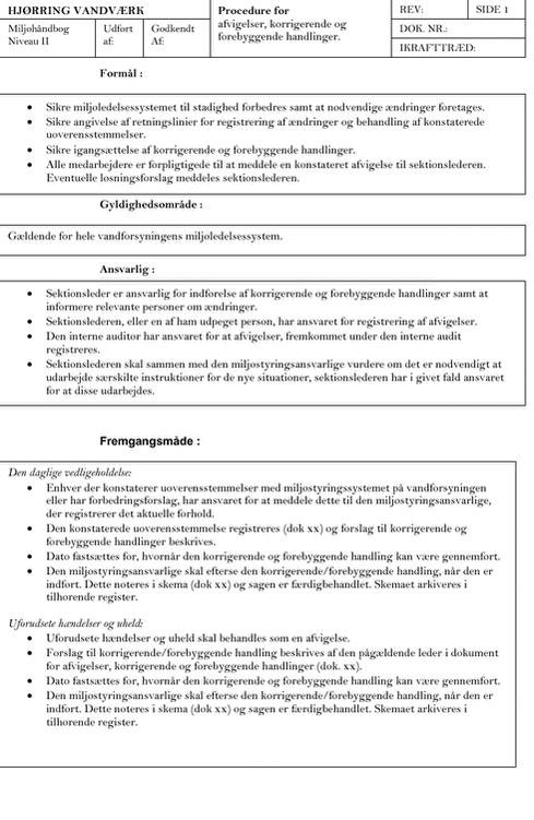Bilag K - Procedureeksempler fra vandforsyningens miljøhåndbog