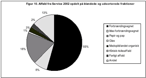 Servicesektorens affald opdelt på blandede og udsorterede fraktioner fremgår af figur 10. Den procentvise fordeling er stort set den samme i 2002, som den var i 2001. Forbrændingsegnet affald og papir og pap udgør de to store fraktioner i affaldet fra servicesektoren med hhv. 55% og 18%.