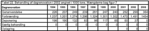 Som nævnt tidligere var mængden af dagrenovation i 2002 på 1.700.000 tons, hvilket er 1.000 tons mindre end i 2001. Siden 1994 har mængden af dagrenovation varieret lidt fra år til år uden at der dog har været en klar tendens – set over hele perioden er mængden steget med 7%, jf. tabel 3.