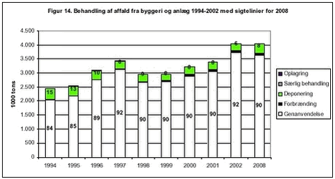 Som det ses af figuren er genanvendelsen af bygge- og anlægsaffaldet steget med 8 procentpoint i perioden 1994 til 2002. Tilsvarende er andelen af affaldet, der deponeres faldet med 9 procentpoint. Det ses også af figuren at fordelingen på de enkelte behandlingsformer siden 1997 har været i overensstemmelse med sigtelinien for 2008.