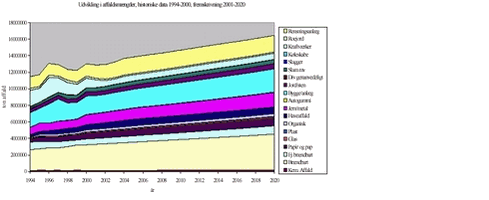 En basisfremskrivning af affaldsmængderne forudser en stigning i de samlede affaldsmængder fra år 2000 til 2020 på 27% svarende til en stigning fra 13 mio. tons i 2000 til 16,5 mio. tons i 2020, jf. figur 133.