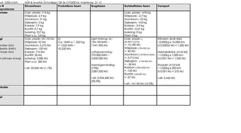 - Energiforbruget til produktion antages at være 1 kWh per kg produceret produkt, hvilket er et erfaringstal for simple jern- og metalkonstruktioner. Kun en lille del af anlægget (motorer etc.) kan betegnes som komplekst. - For energiforbruget under drift er regnet med en effektfaktor på 0,9. Der er regnet med virkningsgraderne 0,75 for 2300 m3/h, 0,85 for 6670 m3/h og 0,87 for 14000 m3/h. - Ventilationsluft opvarmes med termisk energi. Der er regnet med en samlet virkningsgrad på 72 % således at 1 kWh varmetab svarer til 5 MJ primær energiforbrug.