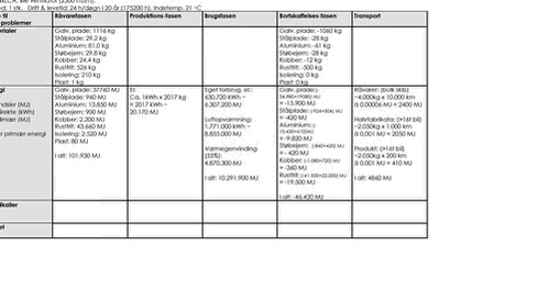 - Al energi er terminal, dvs. regnet tilbage til ressourcerne. - Samlet virkningsgrad beregnes ud fra både energiforbrug til udvinding, raffinering og transport af bændsler (precombustion) og virkningsgrad ved selve energikonverteringen. - For el. energi er regnet med en samlet virkningsgrad på 36%, således at 1 kWh direkte el. energiforbrug svarer til 10 MJ primær energiforbrug. - Materialernes kumulerede energiforbrug er beregnet fra oplysninger i UMIPs enhedsprocesdatabase (se tabel sidste side i bilag a). For materialer som ikke er i tabellen er antaget: