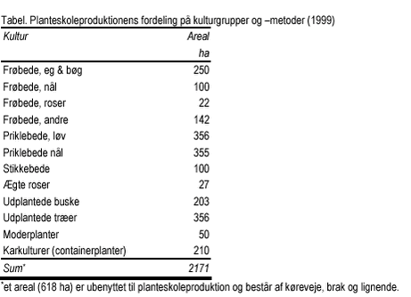 Planteskolerne producerer planter til skov, landskab, læhegn, anlæg, parker, frugtavl og haver. Produktionen af planteskoleplanter i DK er karakteriseret ved en alsidig produktion med et stort antal arter (omkring 300) og sorter. Planteskoleproduktion er udover de mange arter og sorter karakteriseret ved, at planteproduktionen er specialiseret og relativ langvarig og foregår enten som markkulturer eller som containerkulturer, i nogle tilfælde begge dele. Ifølge Danmarks Statistiks tælling i 1999 er der registreret planteskoleproduktion på 2789 ha, når der udelades planteskoler med en størrelse under 2 ha, og disse 2789 ha er fordelt på 206 virksomheder. Af de 2789 ha er 195 ha containerplads og 20,8 ha er væksthusareal. Væksthusarealet anvendes primært til formering, klimaskærm og vinteropbevaring af containerplanter. Da planteskoler under 2 ha er udeladt, medfører det sandsynligvis, at containerpladsarealet er for lavt i forhold til det faktiske areal, da der findes flere mindre containerplanteskoler. Arealet for karkulturer er derfor hævet til 210 ha i tabellen nedenfor. Fordelingen af produktionen på arealerne bygger på et kvalificeret skøn foretaget af konsulent Bent Leonhard, Dansk Planteskoleejerforening, (DPF), og er vist i tabellen nedenfor.