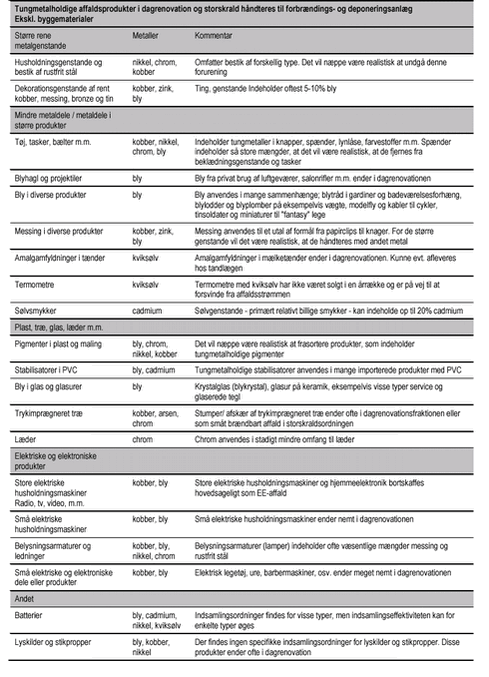 Tungmetalholdige affaldsprodukter i dagrenovation og storskrald håndteres til forbrændings- og deponeringsanlæg Ekskl. byggematerialer.