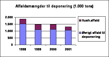 I 2001 blev der deponeret 1,3 mio. tons affald i Danmark. Som det fremgår af figuren herunder, er der sket et markant fald i de samlede, årlige deponerede affaldsmængder på over 0,5 mio. tons fra 1998 til 2001. Som det endvidere fremgår af figuren skyldes faldet i de samlede deponerede affaldsmængder fra 2000 til 2001 primært et fald i de deponerede husholdningsaffaldsmængder.