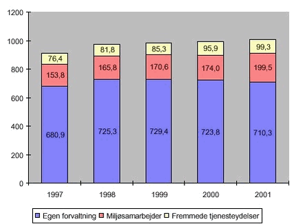 Fig. 2.2 Fordeling af årsværk til miljøforvaltning på egenforvaltning, miljøsamarbejder og fremmede tjenesteydelser 1997-2001