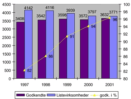De sidste af de gamle listevirksomheder skulle have indsendt ansøgninger om godkendelse inden 1. juli 2000, også selv om virksomheden eksisterede før miljøbeskyttelseslovens ikrafttræden i 1974. Tallene for 2001viser, at godkendelsesprocessen nu næsten er tilendebragt, idet procentdelen af godkendte virksomheder er helt oppe på 96% svarende til, at der kun er ca. 150 virksomheder, der mangler at blive godkendt.