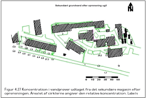 Efter oprensningen og afkøling til ca. 30-40 °C (6 mdr. hvile) er der udtaget en række jord, vand- og luftprøver fra de to oprensningsområder. I figur 4.27 er resultaterne af samtlige vandprøver i de to områder vist. Visuelt kan figur 4.27 sammenlignes med figur 1.12. Som det ses af figurerne er der i langt de fleste af områderne sket en kraftig reduktion af koncentrationerne. Udgangskoncentrationen lå i intervallet op til 3.900 μg PCE/l med et gennemsnit på ca. 800 μg PCE/l. Efter oprensningen er gennemsnittet ca. 30 μg PCE/l med maksimale koncentrationer på knap 500 μg PCE/l. De højeste koncentrationer er konstateret i de to hot-spot, hvor der indledningsvis ikke var udtaget vandprøver. De højeste startværdier repræsenterer derfor ikke de maksimale koncentrationer der var indledningsvis, men er sandsynligvis et udtryk for den mere generelle belastning.