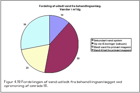 Det ses af figur 4.19 at fordelingen er ca. 50 % fra det sekundære magasin og ca. 50 % fra det primære magasin. Det ses, at hovedparten af vandet fra det sekundære magasin hvor oprensningen foregik, blev ekstraheret via vakuumboringerne, hvorimod systemet der var konstrueret til dette formål kun bidrog med en mindre andel.