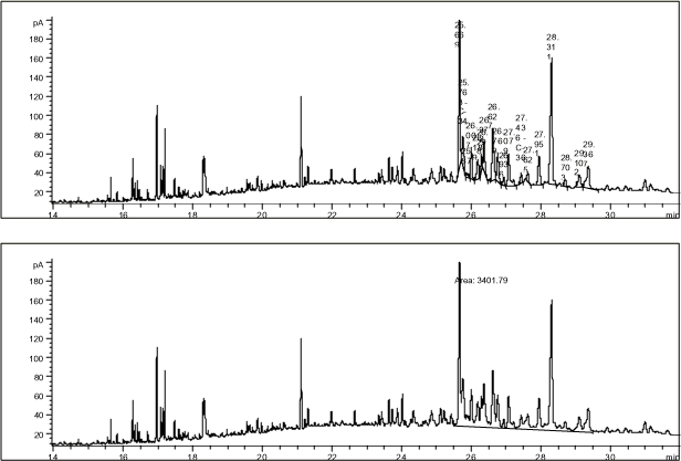 Figur 13-4. Eksempel på automatisk (øverst) og manuel (nederst) integration af phytosteroler i GC-FID