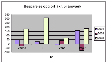 papir er faldet i 2003 både absolut og opgjort pr årsværk. Varmeforbruget er samlet set også faldet men set i relation til antal