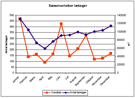 Det er også muligt at benytte illustrere hvordan lækager og lækagetab er fordelt på måneder. Figur 5.12 viser at antallet af lækager