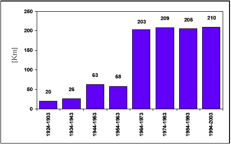 På figur 5.9 er antallet af lækager per kilometer ledning angivet i perioden 1992 til 2003. Tallene viser en faldende tendens gennem