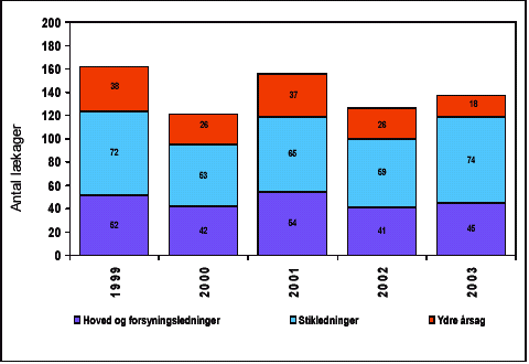 For årene 1999 til 2003 er antallet af brud per år udspecificeret på hoved- og forsyningsledninger, stikledninger og ydre årsager på