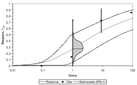 Figur 7.2 Dosis-respons kurve for Rotavirus med indtegnede 95% konfidensgrænser. Den "sande" kurve ligger med 95% sandsynlighed i intervallet mellem de stiplede linier for den undersøgte gruppe af