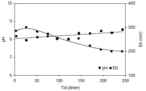 at pH falder gennem forsøget, fra en værdi på 8,5 ved begyndelsen af forsøget til 7,3 ved afslutning af forsøget efter 243 timer. Samtidig stiger redoxpotentialet fra 264 mV ved begyndelsen af forsøget til