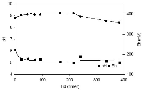 Her fremgår det at pH-værdien i opslæmningen stiger en anelse fra 8,4 ved forsøgets start til 8,6 efter 46 timer hvorefter der sker et generelt fald til 7,7 målt efter 384 timer. Redoxpotentialet er målt til 295