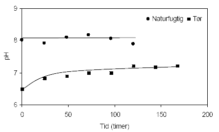 opslæmningen med den naturfugtige prøve stiger markant efter de første 48 timer til 8,4, hvorefter pH-værdien atter aftager og når en værdi på 7,8 efter 120 timer. Stigningen i pH-værdien efter de første 48