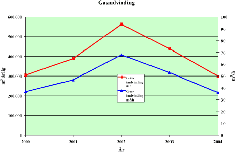 Anlægget blev startet i slutningen af år 2001, hvorfor der kun blev indvundet gas over en kort periode. I 2002 kørte anlægget hele året, men i 2003 var der problemer med motoranlægget,