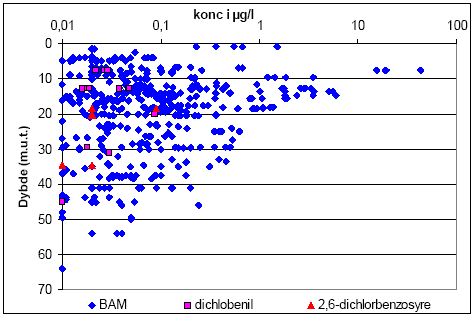 en tydelig sammenhæng mellem stigende dybde og faldende koncentration. Der er kun få fund i små koncentrationer af moderstoffet dichlobenil og metabolitten 2,6-dichlorbenzosyre. Da BAM formodentlig