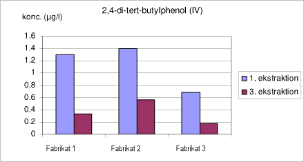Koncentrationerne var mellem 0,05 og 1,5 µg/l. De højeste koncentrationer blev målt for stofferne 2,6-di-tert-butyl-p-benzoquinon (III) og 2,4-di-tert-butylphenol (IV), hvor koncentrationsintervallet var