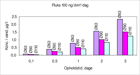I tabel 8.2 er koncentrationen af phthalater i vandet beregnet på baggrund af en fluks på 9 ng/(dm²*d) for forskellige ledningsdimensioner og opholdstider. Selv ved høje opholdstider og små