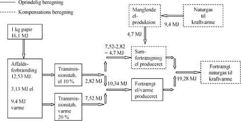 Tabel 5.13 viser de korrektioner der er foretaget af hensyn til systemudvidelser (se tabel 3.1) og anvendelse af marginal el energi (se afsnit 3.5.2.1). Varmeeksporten antages at fortrænge ikke-allokeret naturgas CC (se afsnit 3.4.3.1). Ved affaldsforbrænding af 1 kg papir fremstilles 12,53 MJ el og varme i forholdet ca. 25/75. Distributionsstab udgør 20 % for varmen og 10 % for el svarende til 17,5 % vægtet. Fraregnes de 12,53 MJ el og varme distributionstabet på 17,5 %, er netto energieksporten 10,34 MJ = 2,87 kWh. Denne energimængde fortrænger en tilsvarende produceret mængde naturgas CC el/varme uden allokering. Fordelingen af el og varme fra CC produktion er typisk ca. 50/50 og dette er skævt i forhold til affaldsforbrændingens 25/75 fordeling, og samlet set kommer der til at mangle el når man fortrænger kraftvarmeproduceret (el-rig) energi med affaldsforbrændings produceret (el-fattig). Reviewer har påpeget, at det er muligt at kompensere for denne skævhed, og kompensering er udført i scenarierne for 100 % forbrænding, men ikke i de øvrige, da dette grundet høj genanvendelsesgrad næsten ikke ændrer resultaterne. Kompenseringen er udført ved at beregne den fortrængt naturgasmængde på inputsiden til kraftvarmeproduktionen frem for den producerede energimængde, se nedenstående beskrivelse og figur 5.1.