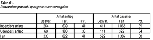 Generelt sikrede antallet af indkomne besvarelser, at oplysninger om et repræsentativt udvalg af bassiner blev indhentet. Dette er illustreret i tabel 6-1. Det ses, at besvarelsesprocenten var i størrelsesordenen 35-40 pct. uanset om målt på antal anlæg eller antal bassiner.