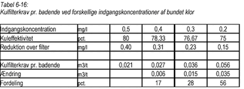Klik på billedet for at se html-versionen af Tabel 6-16 Kulfilterkrav pr. badende ved forskellige indgangskoncentrationer af bundet klor