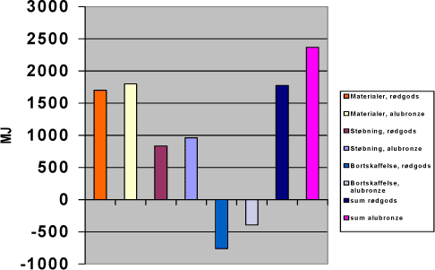Energiprofil for gråt støbejern, maskinformet 1.6.3.1 MaterialerGråt støbejern fremstilles af 100% skrot. Herudover anvendes sand og ler/bentonit. Affaldet udgøres af nedbrudt sand. 1.6.3.2 EnergiEnergiprofilen er domineret af materialer efterfulgt af produktion og brug(spåntagning). 1.6.3.3 KemikalierDer anvendes samme bindere for de to maskinformede produkter. 1.6.3.4 AndetIntet er nævnt. 1.6.4 Rødgods og aluminiumbronze, sandstøbningDer var udvalgt to produkter til denne kategori, nemlig et pumpehjul fremstillet af hhv. alubronze (Cu, Al, Fe, Ni, Mn) og rødgods (Cu, Sn, Zn, Pb). Vægt hhv. 18 kg og 20 kg.