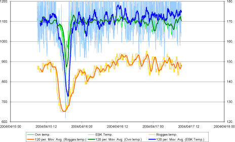 Forskellene på driftsforholdene under forbrændingstesten med dagrenovation og ved normalt affald ses tydeligt af figur 8 og figur 9. Under normal drift foregår forbrændingen stabil i den forreste del af ovnen (Ovn temp. 1) og den bagerste del fungere som efterforbrænding der kan opfange uforbrændt materiale og derfor variere ovn temp. 2 en del. Under forsøget (figur 8) ses mere ustabil forbrænding fordelt i hele ovnen, hvorfor ovn temp. 1 og 2 er ens og EBK temperaturen noget lavere end normalt.