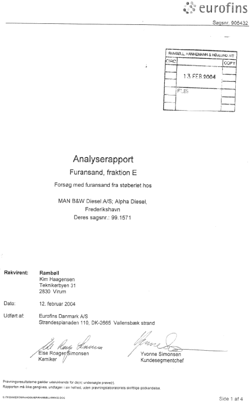 Dette projekt har haft til formål at undersøge indholdet af miljømæssigt problematiske stoffer i fem fraktioner af kemisk bundet overskudssand fra støberiet på virksomheden MAN B&W Diesel A/S i Frederikshavn. På baggrund af kemiske analyser af de fem fraktioner af overskudssand, samt en undersøgelse af sandkredsløbet i støberiet hos MAN B&W Diesel A/S, er hver af de fem fraktioners mængdemæssige størrelse og kemiske sammensætning belyst.