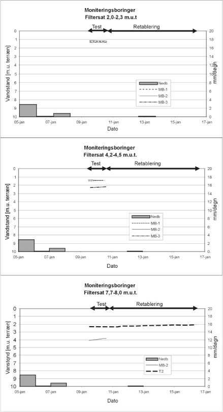 Det har under testene ikke været muligt at konstatere en direkte sammenhæng mellem vandstanden i moniteringsfiltrene og den målte nedbør.