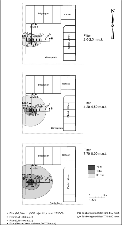 Baseret på de registrerede påvirkninger korrigeret for nedbør, er et konservativt skøn af den horisontale udbredelse af afsænkningen (> 10 cm) vist på figur 6.13 for de 3 observerede niveauer. Påvirkningen er størst i det nederste niveau (4,2-4,5 m.u.t.), hvorfra der også påtrykkes et vakuum. Influensradius i det nederste niveau er med sikkerhed > 5 m og skønnes at være af størrelsesorden 7-8 m, mens den tilsvarende radius i det mellemste niveau (4,2-4,5 m.u.t.) er ca. 5 m. I det øverste niveau skønnes influensradius at være af størrelsesorden 2-3 m. Endvidere viser pejleresultaterne, at afsænkningen udbredes nogenlunde radiært fra testboringen, dog med en tendens til større afsænkning i øst-vestlig retning. På figur 6.14 er udbredelsen af afsænkningen ligeledes optegnet i 2 vertikale snit. Det ses af figur 6.13, at udbredelsen af afsænkningen er større i øst-vestlig retning end i nord-sydlig retning.