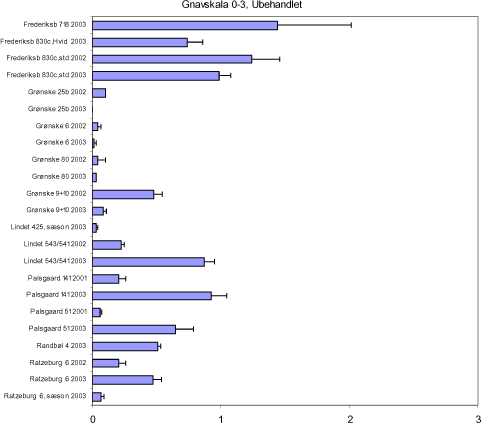 Figur 3. Skadetryk – opgjort efter skalaen 0-3 - på de ubehandlede træer ved alle de 35 opgørelser af gnav. 4.1.2 Fordelingen af skadeklasserne på gnavskalaen 0-3Figur 4 viser fordelingen af de bedømte træer på de fire skadeklasser i 0-3 skalaen. Det er væsentligt på denne figur at være opmærksom på, at der kun er ganske få stærkt skadede træer (værdi 3) på de fleste lokaliteter. Således er der kun væsentlig mere end 10% i denne kategori på Frederiksborg 718 i 2003. (evt. omregnet fra 0-5 skala eller mm² skala, se tabel 4)