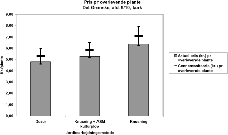 Figur 26. Pris pr overlevende plante ved forskellige former for jordbearbejdning. Gældende for lærk på Det Grønske skovdistrikt, afd. 9/10. Søjlerne er baseret på de aktuelle omkostninger forbundet med jordbearbejdning forud for forsøgsanlægget. Den vandrette streg er baseret på gennemsnitlige omkostninger for tilsvarende kulturetableringstiltag på distriktet, samt deres variation angivet som 95% konfidensinterval.